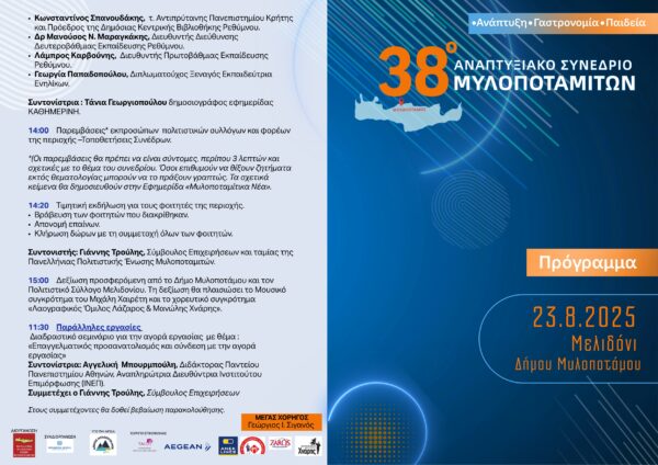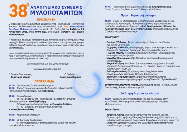 Η «Πανελλήνια Πολιτιστική Ένωση Μυλοποταμιτών», με τη στήριξη της Περιφέρειας Κρήτης και υπό την αιγίδα του Δήμου Μυλοποτάμου, πραγματοποιεί το 38ο Αναπτυξιακό Συνέδριο Μυλοποταμιτών, το Σάββατο 23 Αυγούστου 2025 και ώρα 10.00 το πρωί στο χωριό Μελιδόνι της Δημοτικής Κοινότητας Μελιδονίου, του Δήμου Μυλοποτάμου. Βασικά θέματα που θα απασχολήσουν το συνέδριο θα είναι «Η Ανάπτυξη, η Γαστρονομία και η Παιδεία».